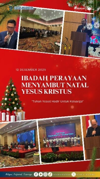 MANADO, SpiritKawanua.com – Keluarga besar Kantor Wilayah BPN Sulawesi Utara mengadakan ibadah perayaan menyambut Natal Yesus Kristus, di Hotel Aston Manado, 12 Desember 2025. Natal yang berlangsung dengan penuh sukacita itu mengangkat tema ‘Tuhan Yesus hadir untuk keluarga’.