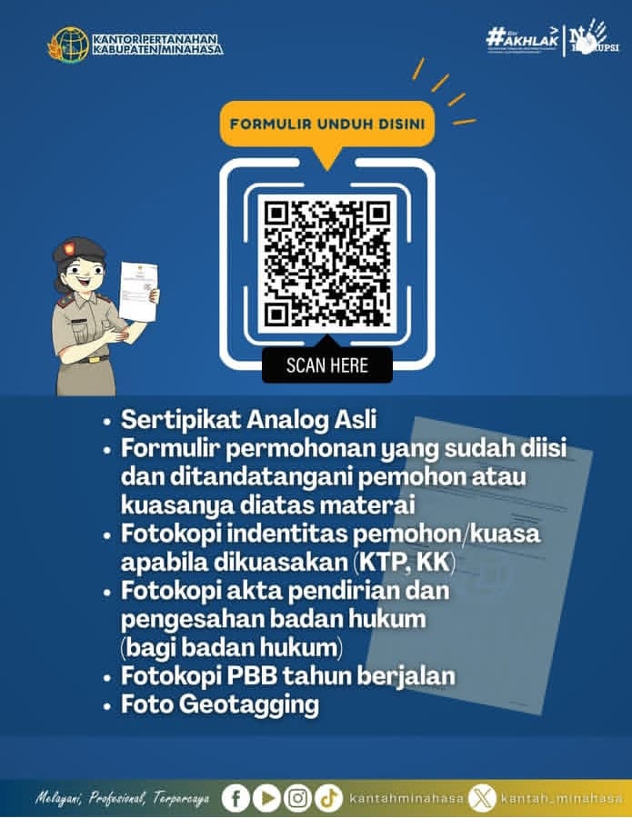 Saat Anda datang ke Kantah Minahasa untuk menggantinya perlu Anda siapkan Sertipikat Analog asli. Kemudian, formulir permohonan yang sudah diisi dan ditandatangani pemohon atau kuasanya di atas materai.