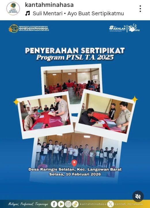MINAHASA, SpiritKawanua.com – Kantor Pertanahan Kabupaten Minahasa melaksanakan kegiatan penyerahan sertipikat tanah program Pendaftaran Tanah Sistematis Lengkap (PTSL) tahun anggaran 2025 kepada masyarakat Desa Raringis Selatan, Kecamatan Langowan Barat, Senin (10/2/2026).