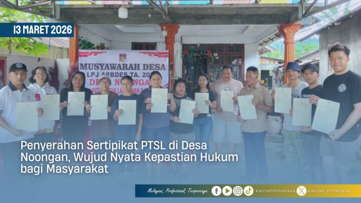TONDANO, SpiritKawanua.com – Kantor Pertanahan Kabupaten Minahasa melaksanakan penyerahan sertipikat tanah kepada masyarakat melalui program pendaftaran tanah sistematis lengkap (PTSL) tahun 2025 di Desa Noongan II Kecamatan Langowan Barat, 13 Maret 2026.