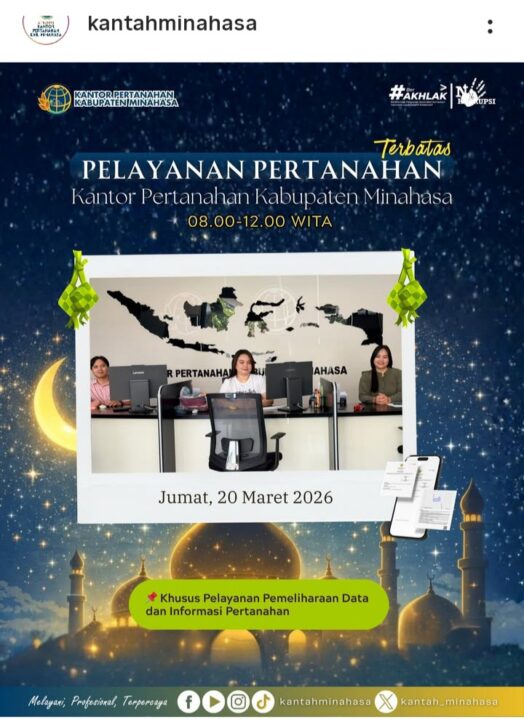 Adapun pelayanan dibuka pada Jumat 20 Maret 2026 mulai pukul 8 pagi hingga pukul 12 WITA. Pelayanan yang dimaksud khusus pelayanan pemeliharaan data dan informasi pertanahan.